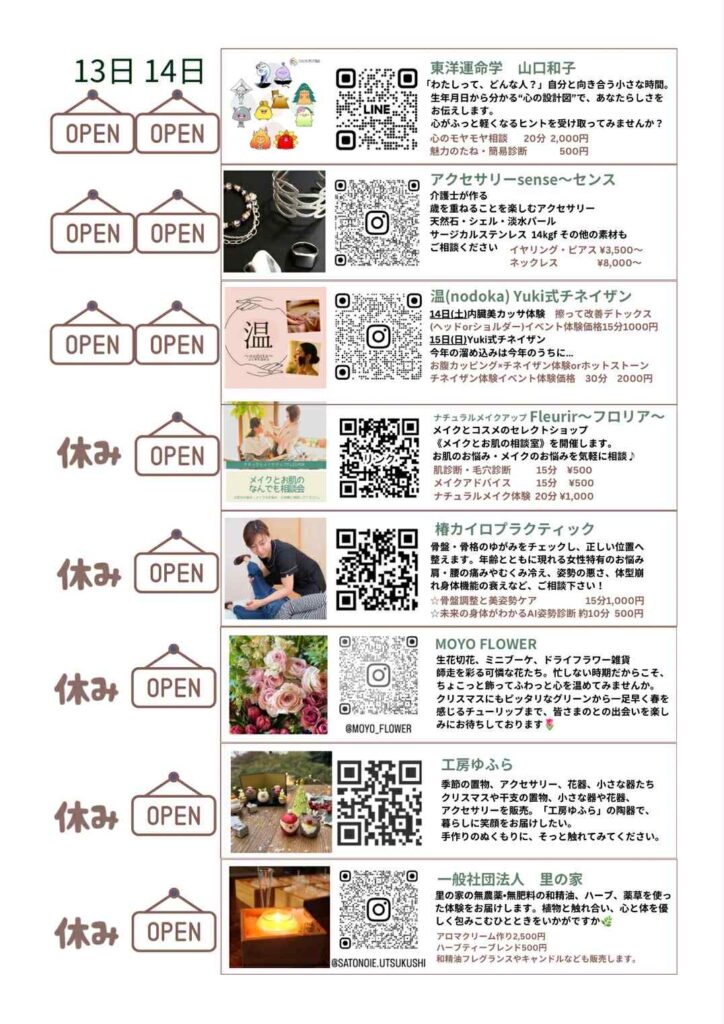 アクセサリーやメイクで自分磨き、ボディケアやアロマで体の疲れをリセット、運命鑑定で心のモヤモヤをスッキリ——どのブースも年末にぴったりの内容となっています。