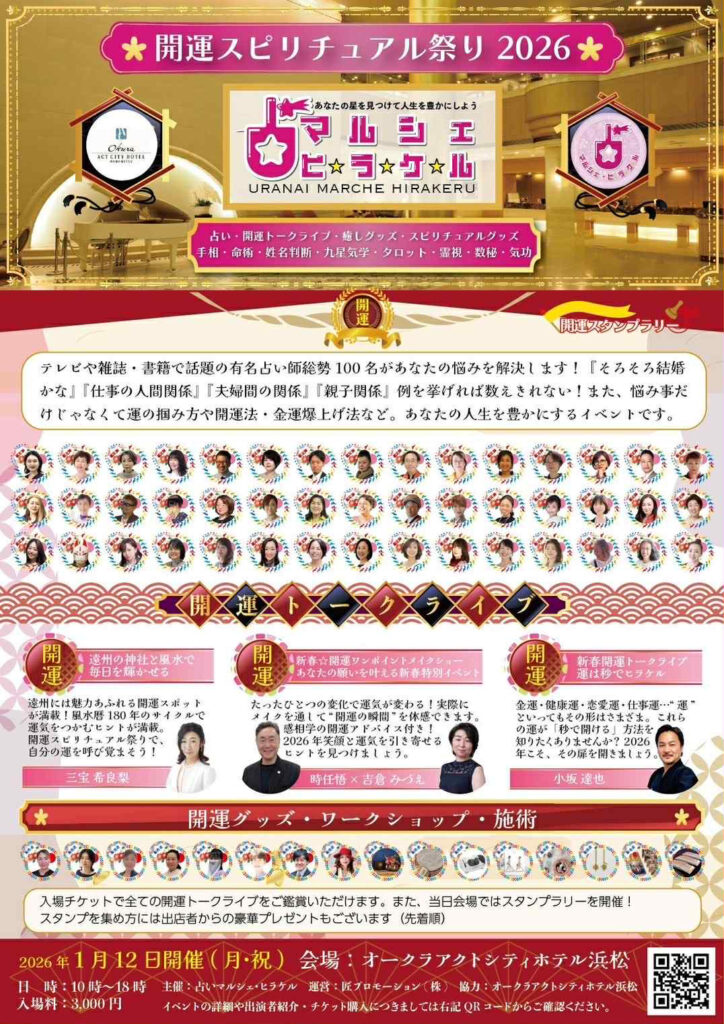 イベント名: 開運スピリチュアル祭り2026 占いマルシェ☆ヒラケル 日時: 2026年1月12日(月・祝)10:00〜18:00 会場: オークラアクトシティホテル浜松 入場料: 3,000円 主催: 占いマルシェ・ヒラケル 運営: 匠プロモーション(株)